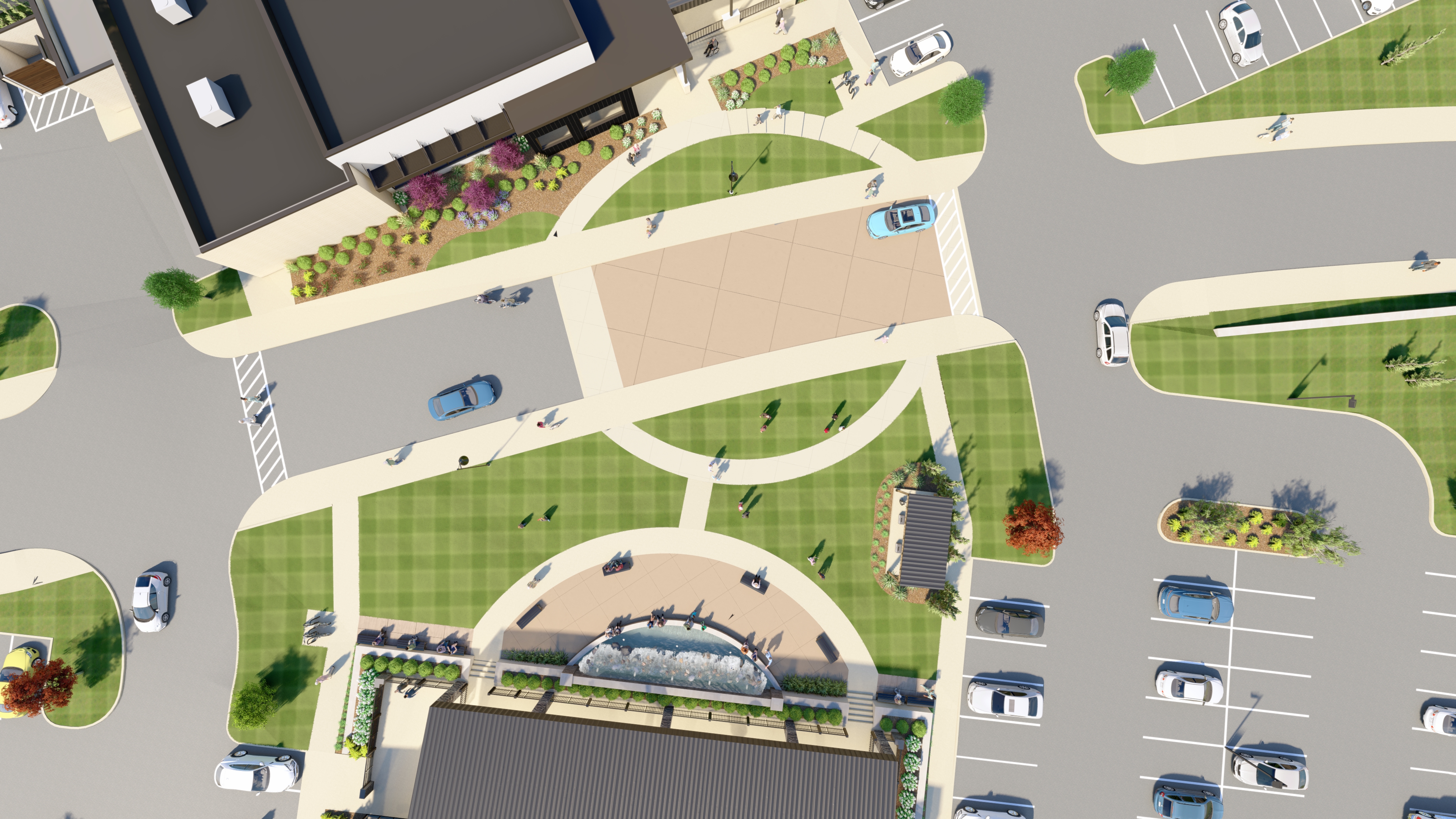 The gathering space will feature natural turf, a fountain designed to be attractive all year long (even during the winter when it’s not running), nice landscaping, benches and seating throughout, and even a stage for concerts and other events.