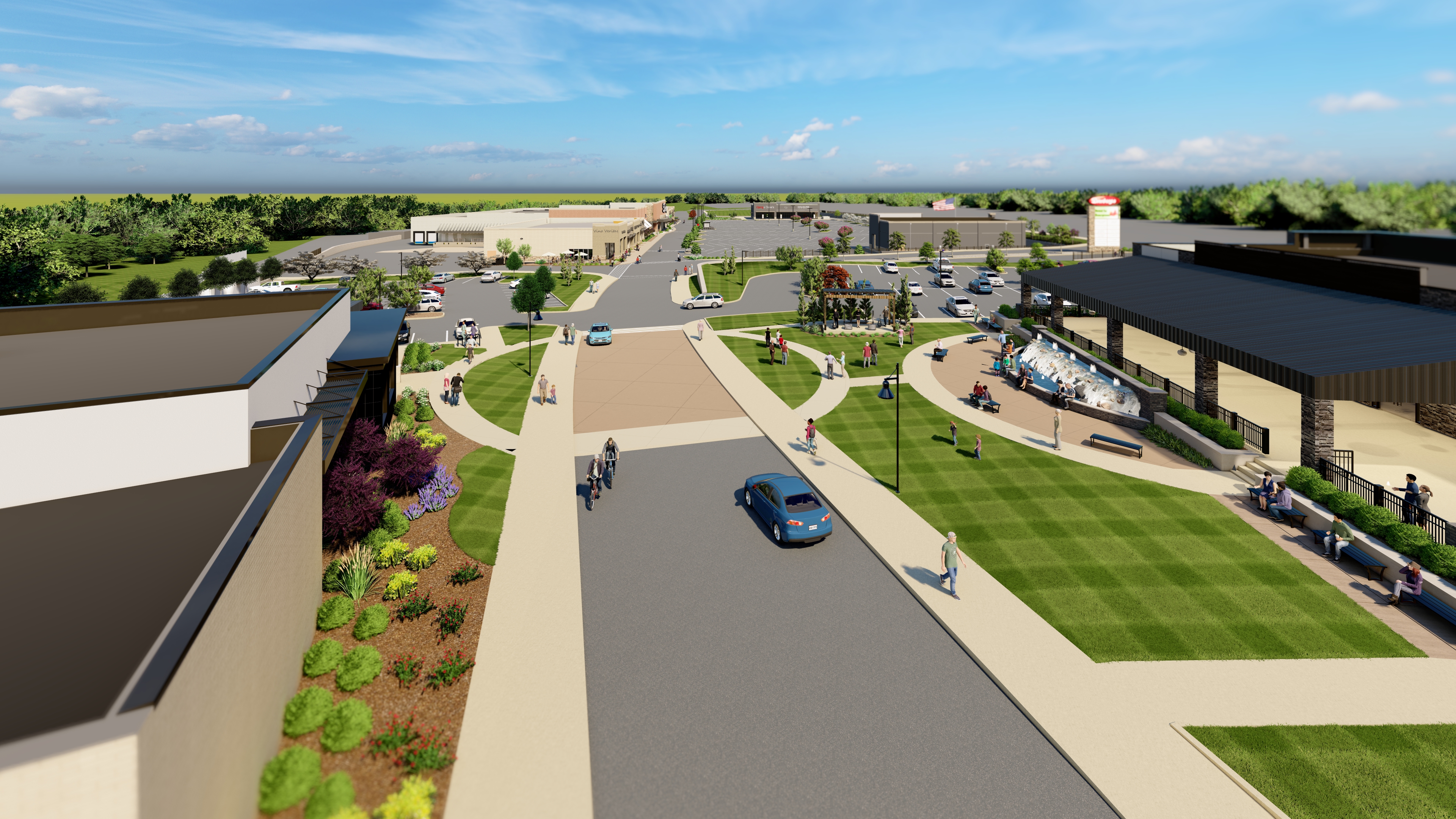 Some have asked about the road running through that gathering space. This is the existing “drive” that connects Sappington Road to the Dierbergs main site. While this road is not as busy as the two Watson Road entrances, there will still be vehicles using it. To help ensure safety for pedestrians in the area, the road will be resurfaced to match the other features in the space, crosswalks will be clearly indicated, and “flashing light” signs will remind drivers to watch for pedestrians. During large events such as a popular concert, or Cinco de Mayo, that road can be closed to traffic. It’s also worth noting that semi-trucks will not use that road - they use the entrances off Watson Road.
